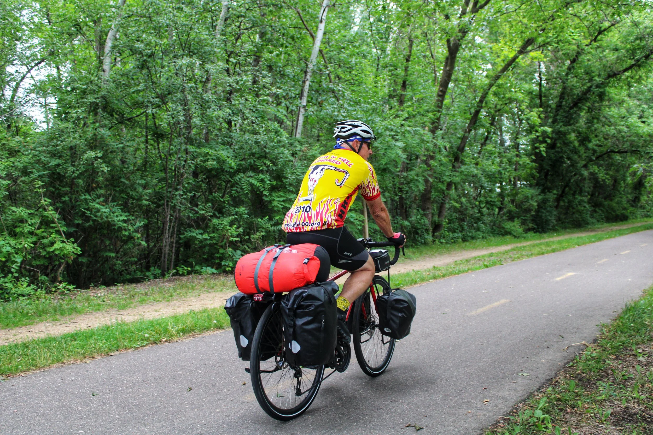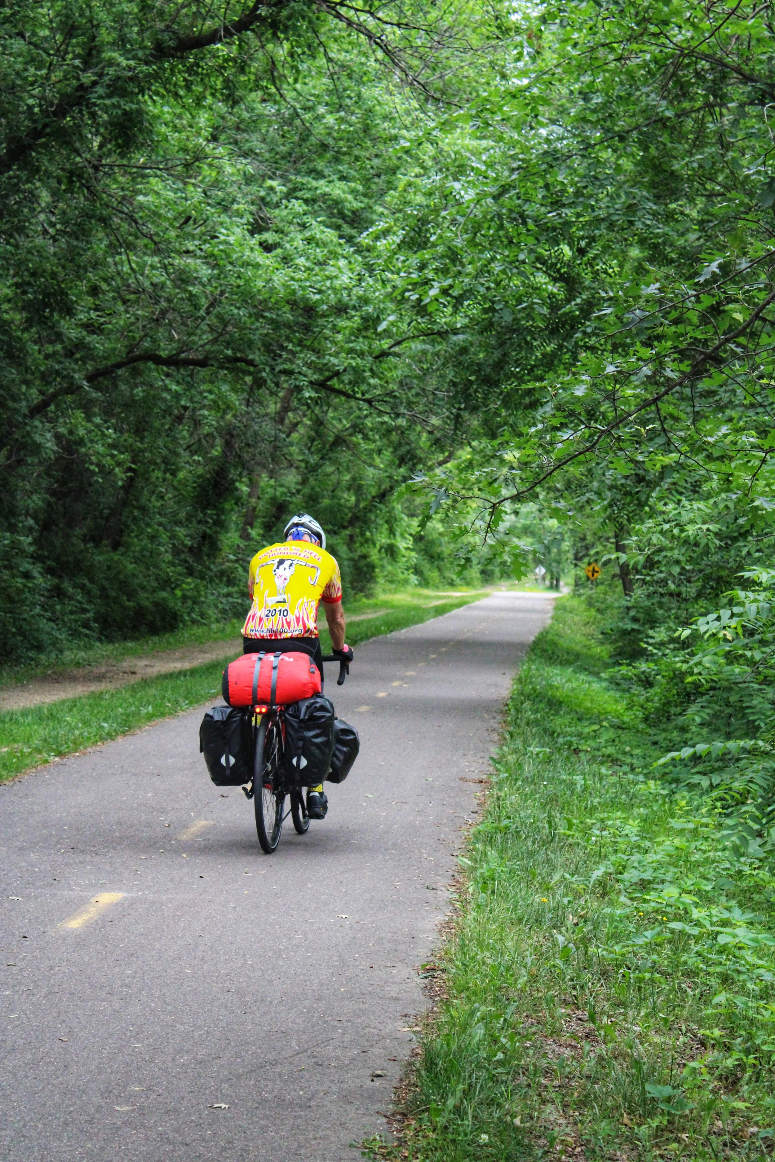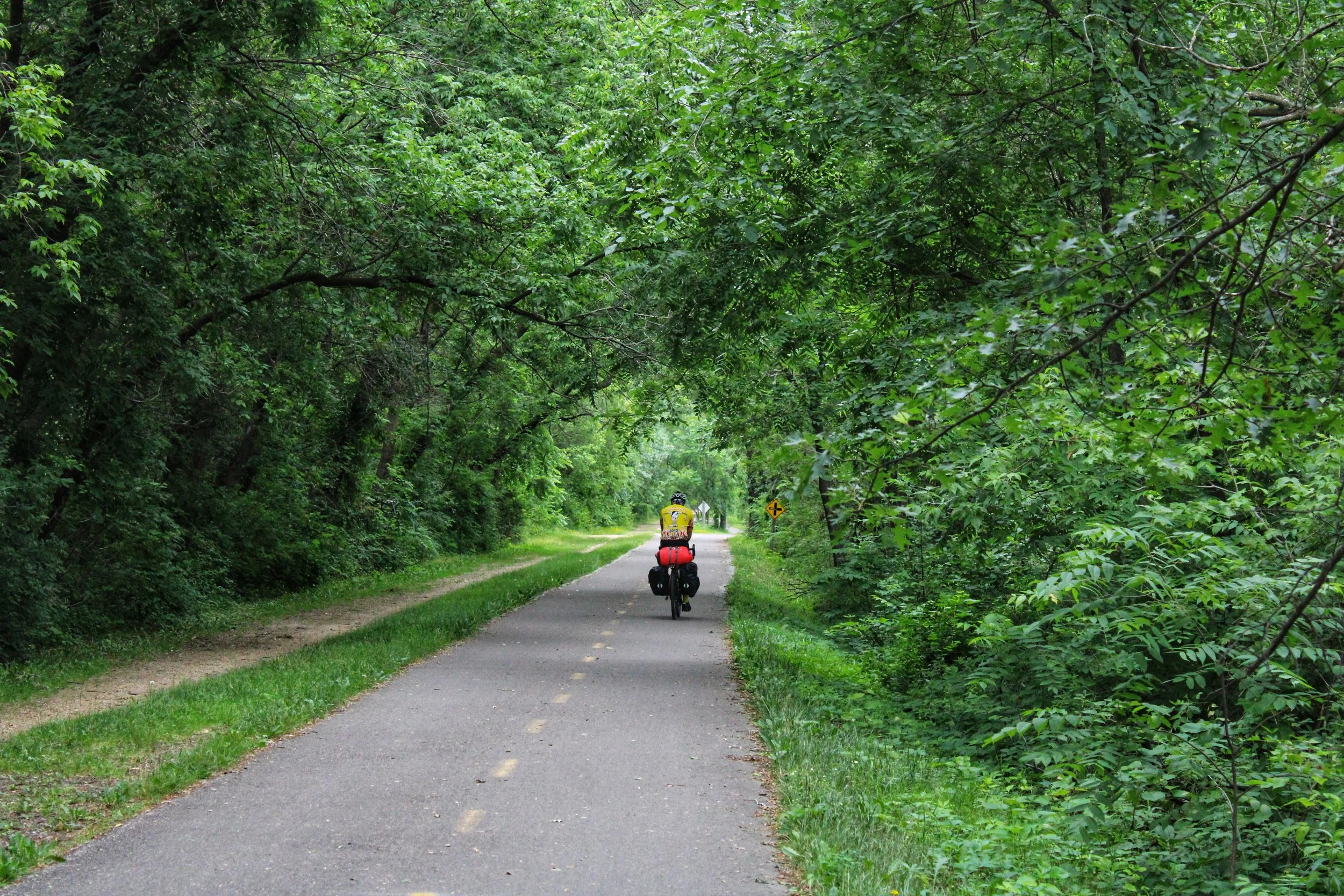 I watched Larry attach the pannier bags, put on his shoes and pedal away. He grew smaller and smaller, fading into a tiny red and yellow dot surrounded by greenery until he was no more.